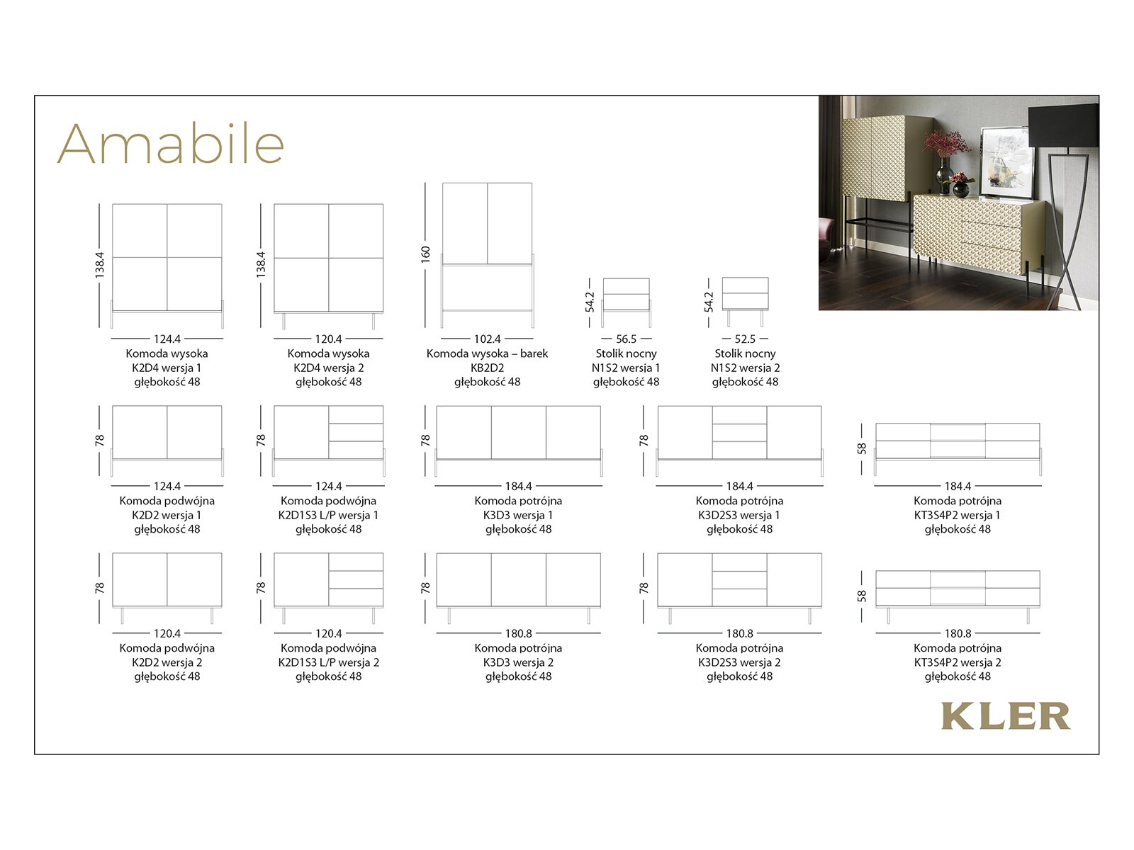 Komoda w kolorze kremowym perłowym, lakierowany na wysoki połysk (Perla champagne lucido), dostępna jest również w innych kolorach. Prosty stelaż wykonany z metalowych prętów, malowanych na kolor czarny, oraz skrzynia o gładkich ścianach i dekoracyjnym froncie. Korpus wykonany z płyty meblowej, natomiast fronty wykonane są z płyty MDF frezowanej jednolitym wzorem. Komoda troje drzwi, za każdymi drzwiami półka szklana. Mebel dostępny w trzech wersjach nóżek.