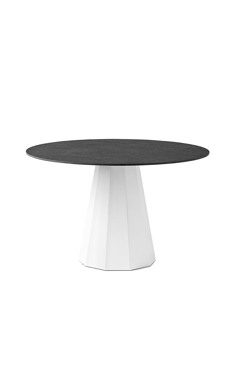 Blat wykonany z ceramiki, melaminy lub płyty meblowej w kilku wariantach kolorystycznych. Podstawa w kształcie stożka, wykończona powlekaną fasetowo blachą w kolorze białym lub czarnym. Dostępny w dwóch rozmiarach.