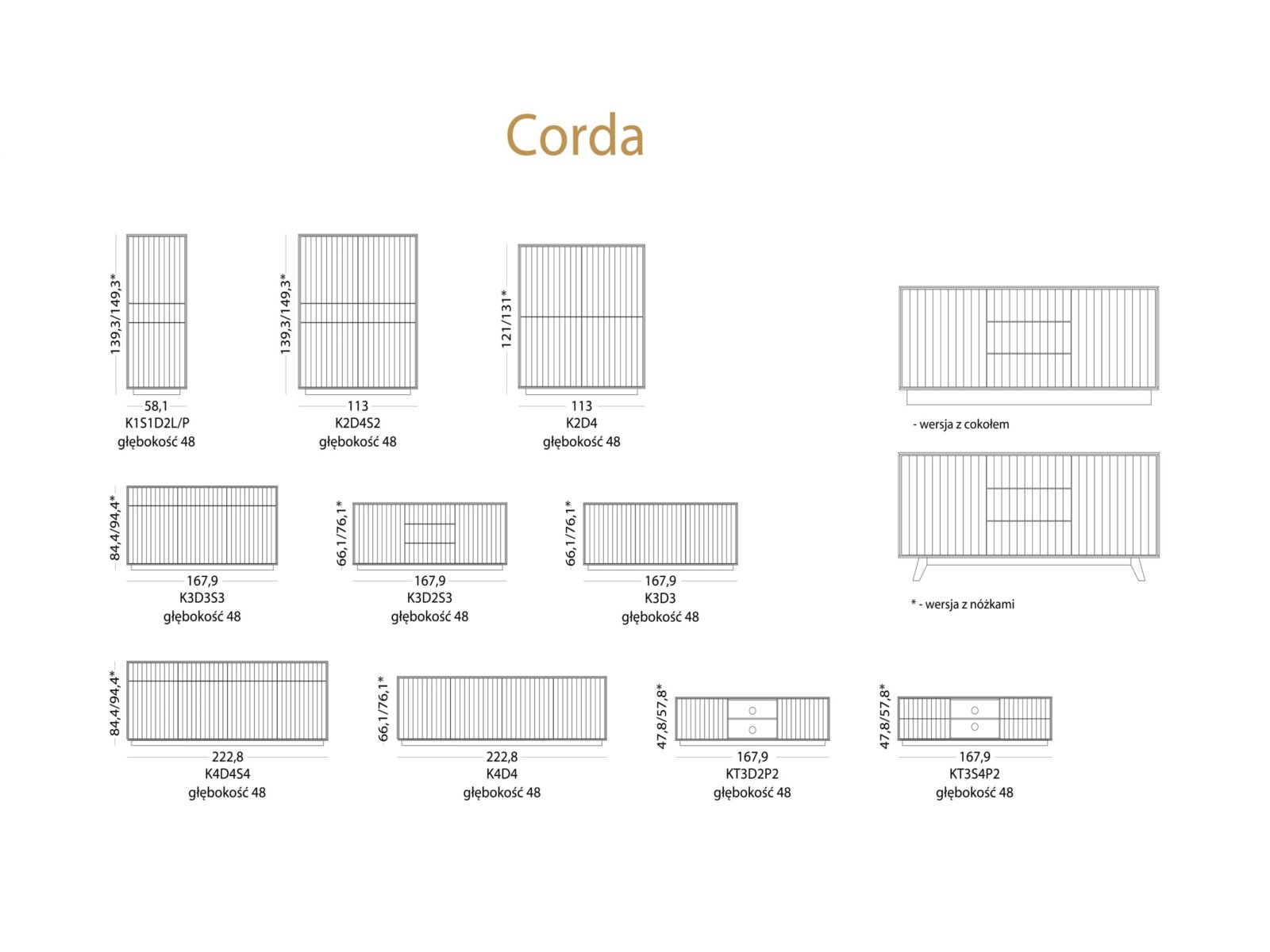 Komoda 3-drzwiowa na cokole, z płyty meblowej, korpus okleinowany naturalnym fornirem dębowym w kolorze brązowym rovere naturale modificato, fronty drzwiczek w kolorze białym bianco lub czarnym nero lacato opaco primo.