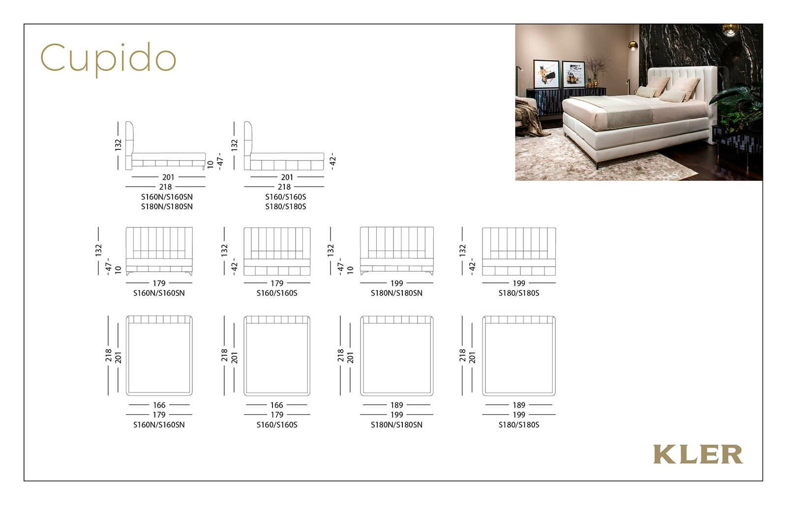 Łóżko kontynentalne w całości tapicerowane skórą lub tkaniną. Wezgłowie posiada charakterystyczne pionowe przeszycia. Do wyboru klienta łóżko wspierające się na dwóch stopkach z przodu oraz wezgłowiu z tyłu lub osadzone w pełni na oskrzyni. Niezależnie od wersji oskrzyni (płytszej lub głębszej) istnieje możliwość wyboru schowka podnoszonego za pomocą siłowników. Łóżko jest dostępne w dwóch wymiarach materaca: 160x200 i 180x200 cm.