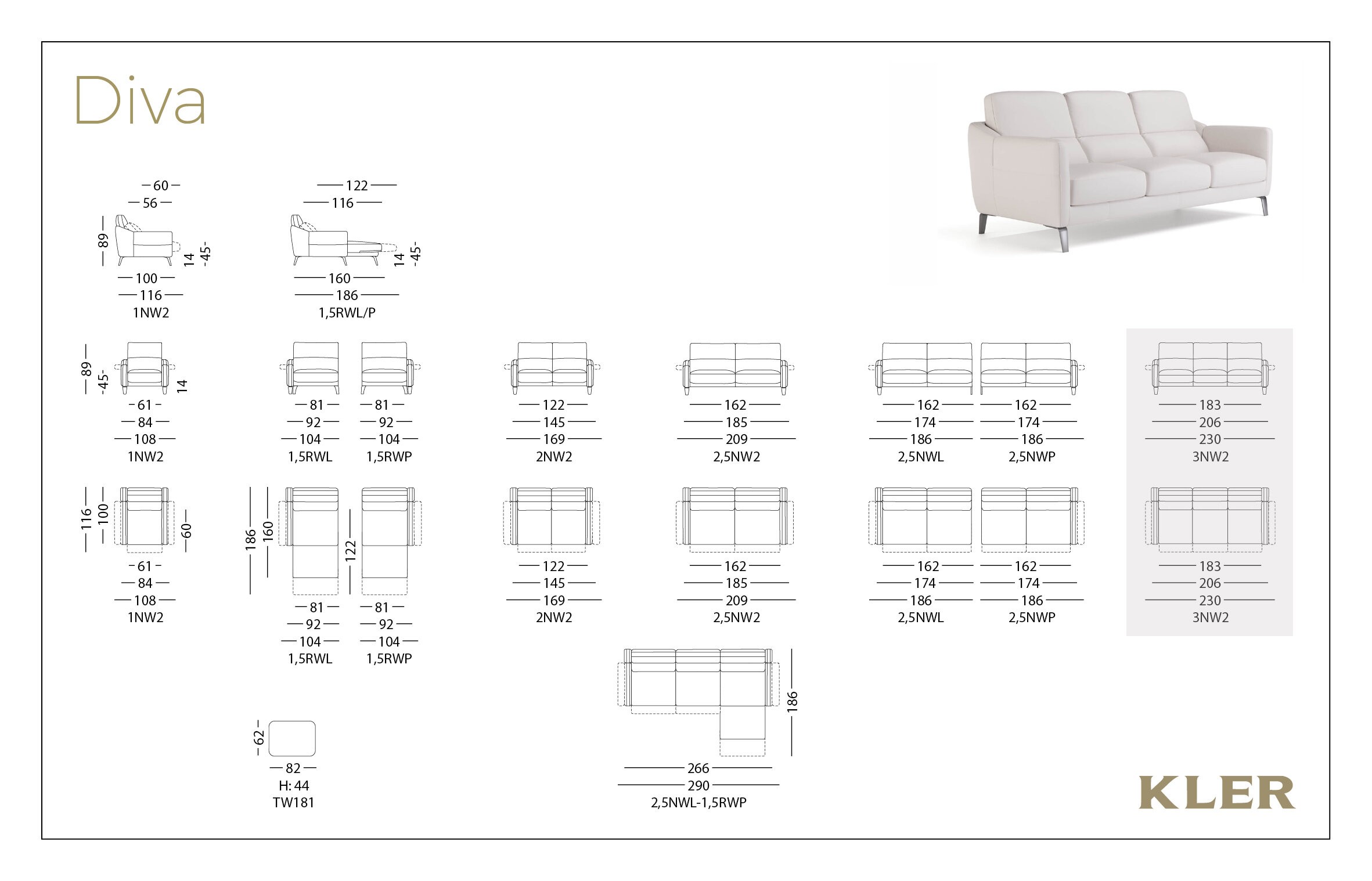 Kanapa 3-osobowa i szezlong w całości tapicerowane skórą lub tkaniną. Podstawę stanowią metalowe delikatne nogi. W kanapie charakterystyczna jest jednoczesna dwustopniowa regulacja siedzisk i oparć poprzez odpowiedni balans ciała. Wyjątek stanowi szezlong, gdzie regulacja następuje za pomocą silnika elektrycznego. Istnieje również delikatna regulacja w części zagłówkowej. Wąskie podłokietniki są standardowo „łamane”.