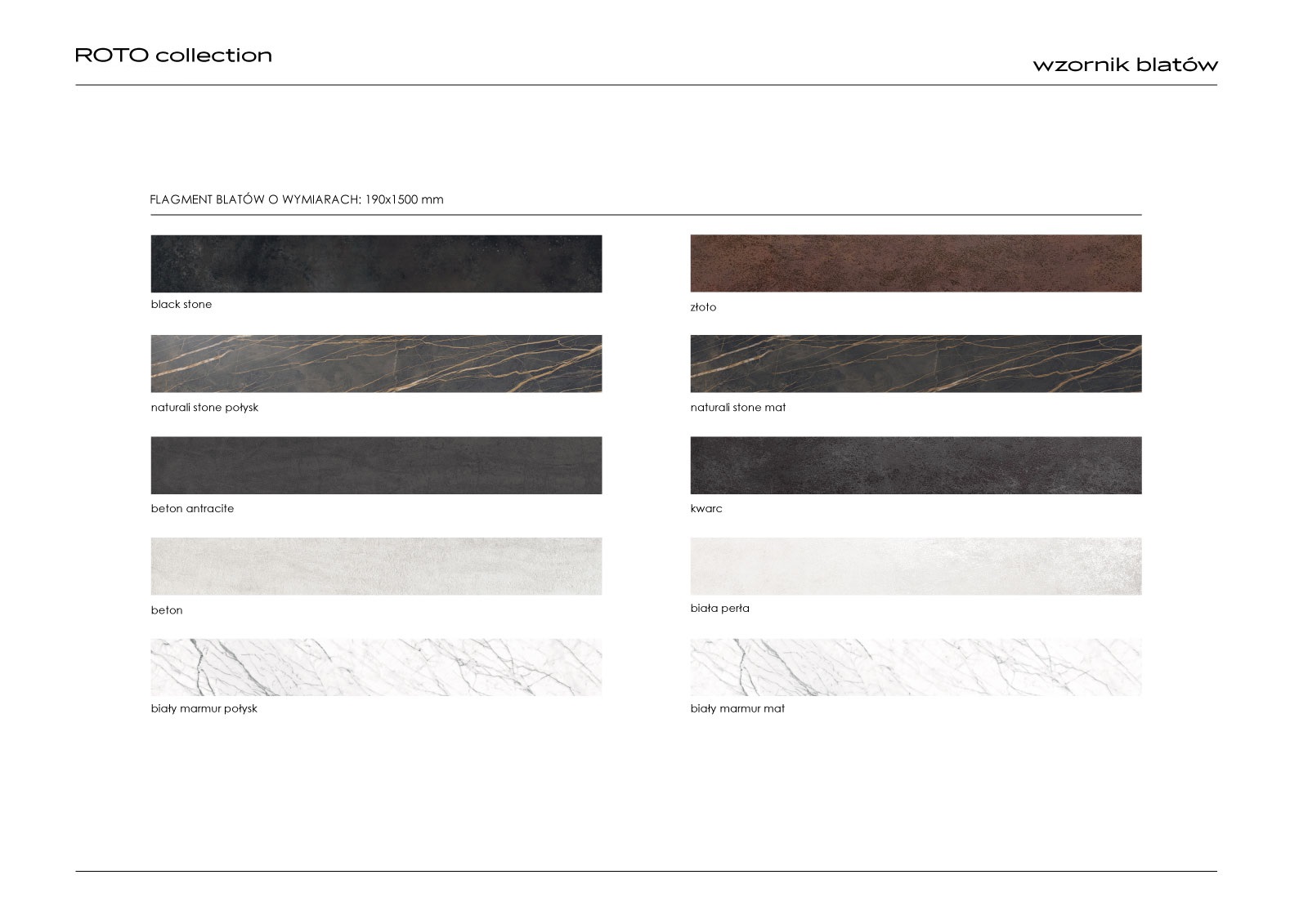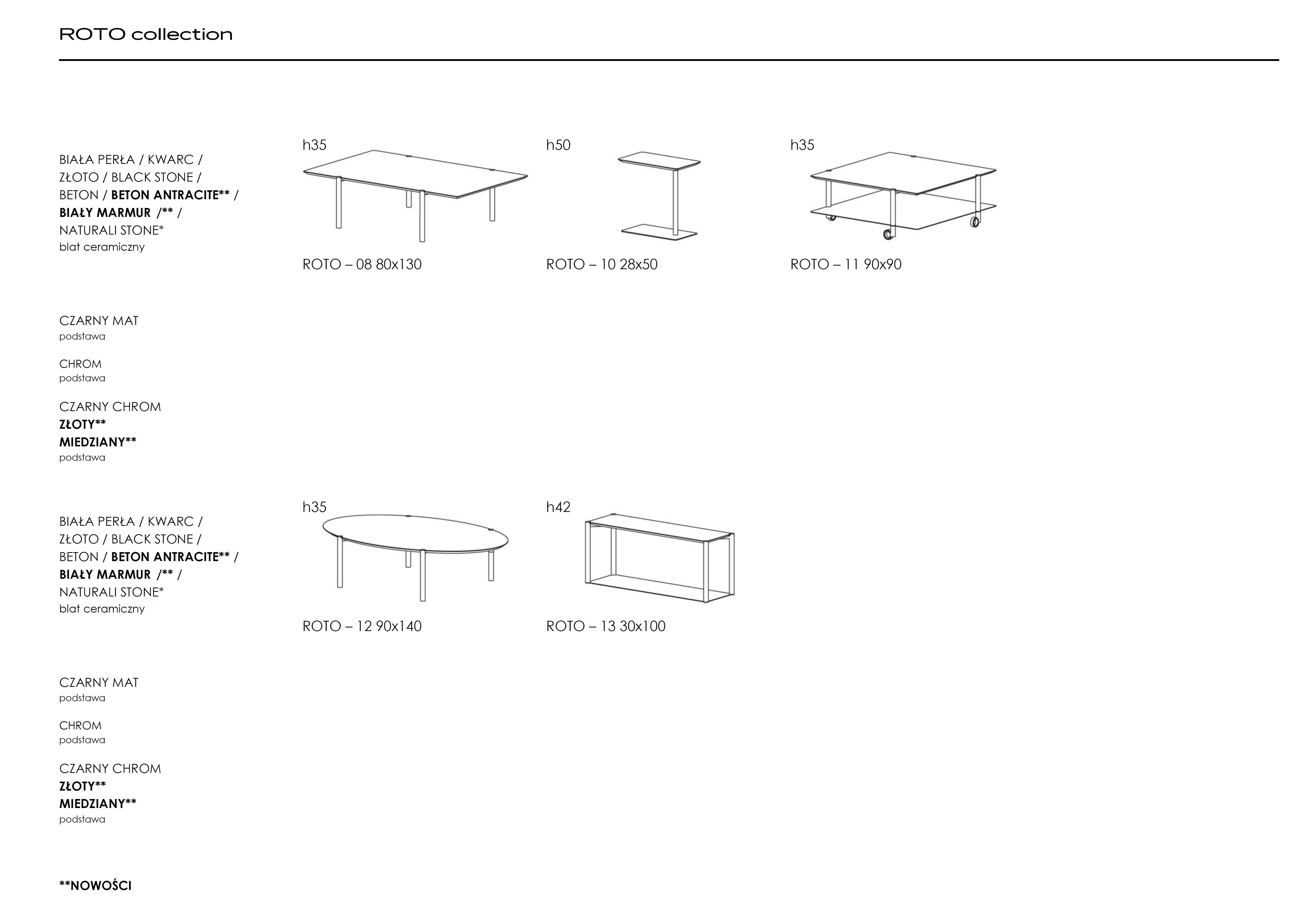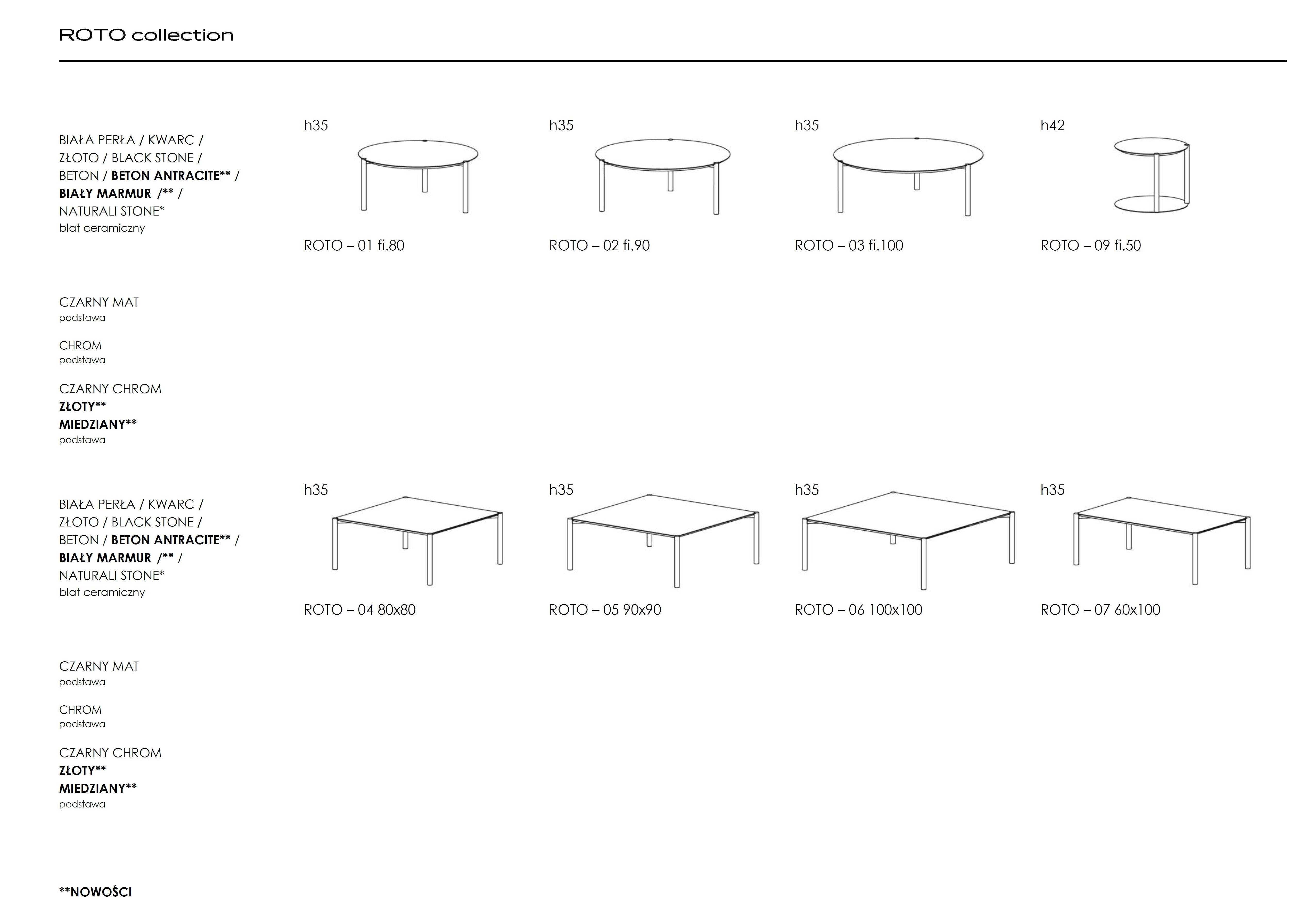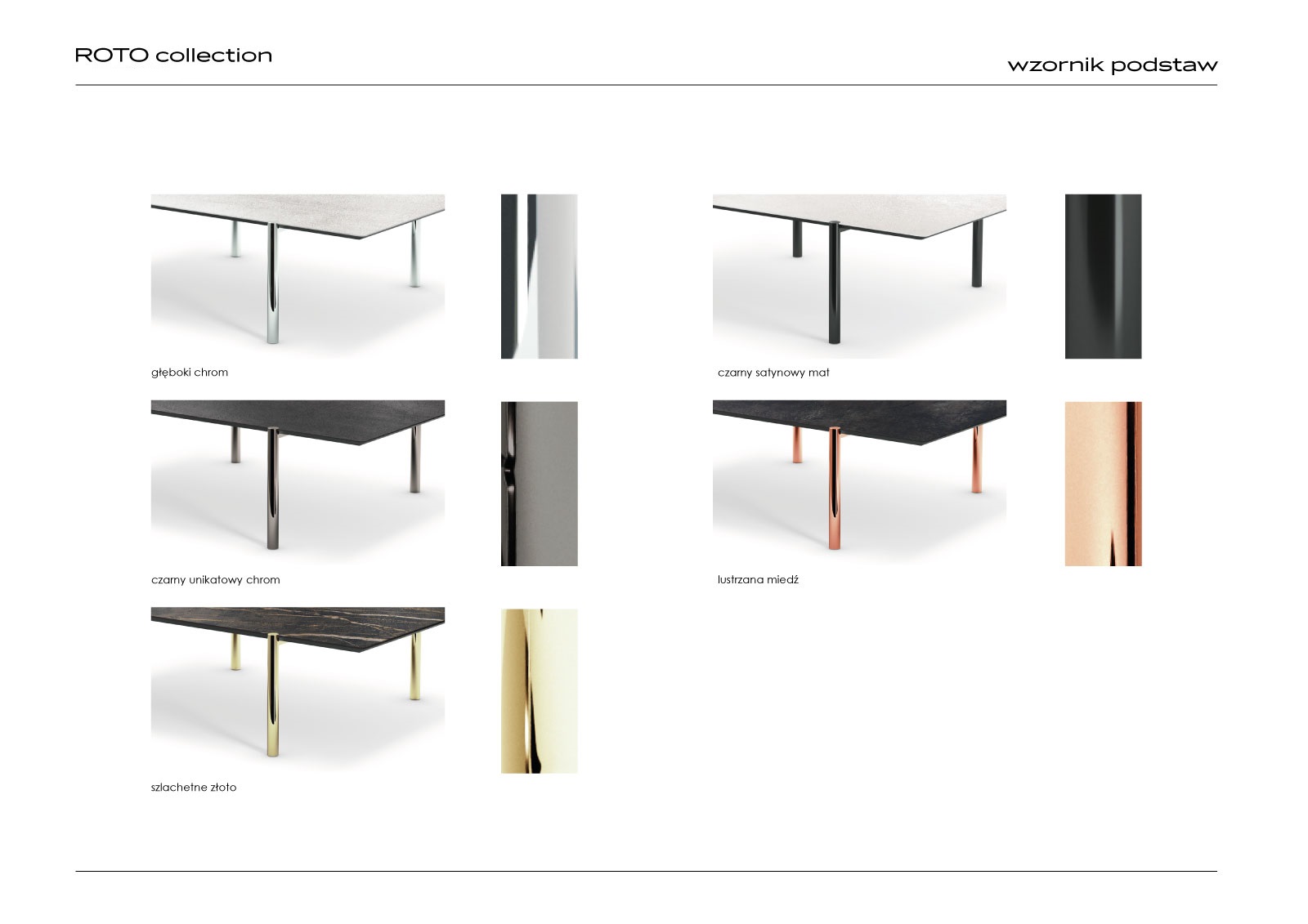 Stolik okrągły, którego blat może być wykonany ze spieków kwarcu, marmuru lub betonu. Metalowa podstawa jest wykończona w kolorze chromu, czarnej satynie, czarnym chromie, miedzi i złota.