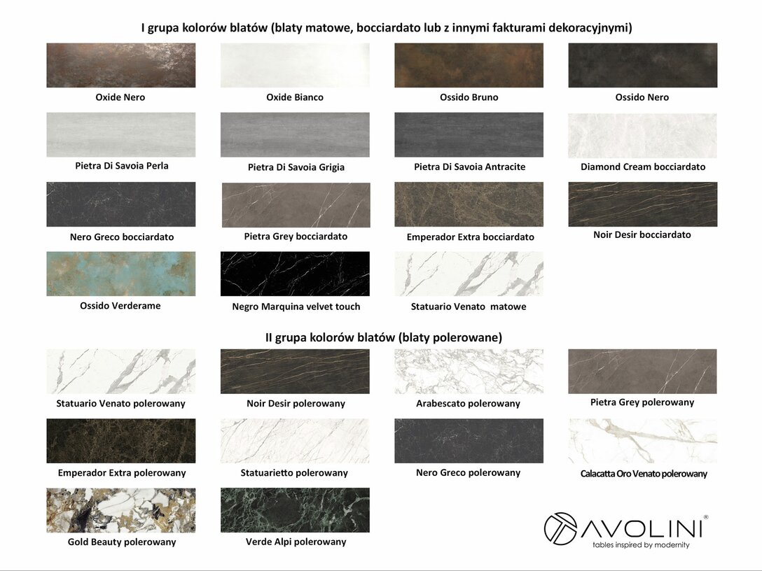 Blat z włoskiego spieku kwarcowego Laminam z odwzorowaniem naturalnego, polerowanego marmuru Arabescato. Blat o grubości 5,6 mm, połączony ze szkłem o grubości 6 mm. Nogi wykonane są ze stali nierdzewnej w dwóch wersjach kolorystycznych: nogi ze stali nierdzewnej polerowanej, oraz ze stali nierdzewnej malowanej proszkowo.
